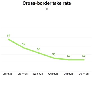 Revenues from non-cross-border (i.e. card usage revenues and other) increased by 26% in H1 of 2026, and now account for 33% of revenues (up from 29% in H1 25).