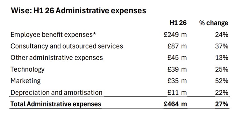 In my view, the H1 FY26 margin compression looks, at least partly, like a deliberate reinvestment choice rather than a sudden deterioration in Wise’s core economics. Wise targets a 13–16% underlying PBT margin, yet in H1 it still allowed costs to step up meaningfully. Administrative expenses up 24% (excluding dual-listing costs). Management points to team expansion as the main driver, with 1,000+ net hires alongside higher spend in areas like marketing and technology, to build capacity, improve service levels and meet regulatory requirements, alongside continued rollout of AI-led efficiencies. This cost step-up came even as Group revenue grew ~11% YoY (with cross-border revenue up only ~5%), which supports the interpretation of a “build-ahead-of-demand” posture. The key question here is whether the higher cost base translates into stronger volume growth, a rising Platform mix and improving unit costs over the next few periods.